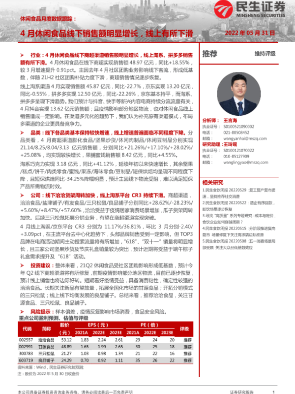 【民生证券】【20220531】20220531-民生证券-休闲食品月度数据跟踪:4月休闲食品线下销售额明显增长,线上有所下滑-10页