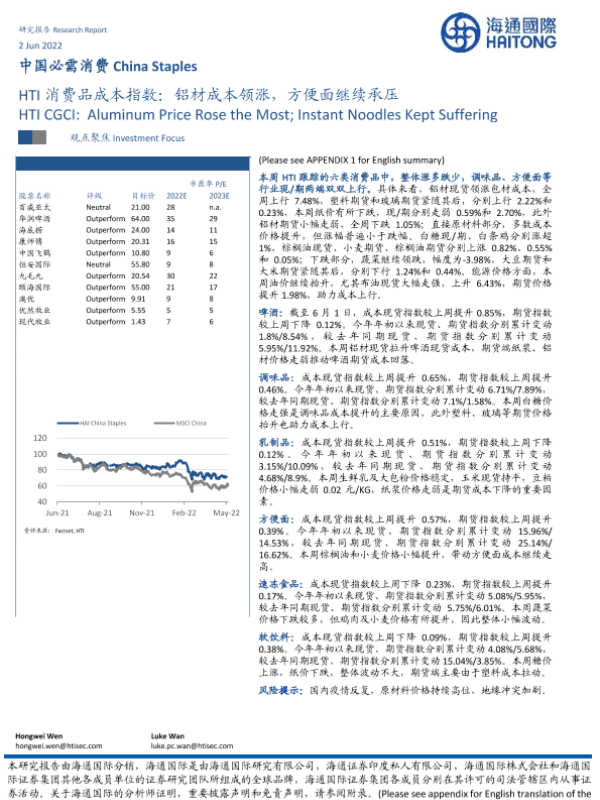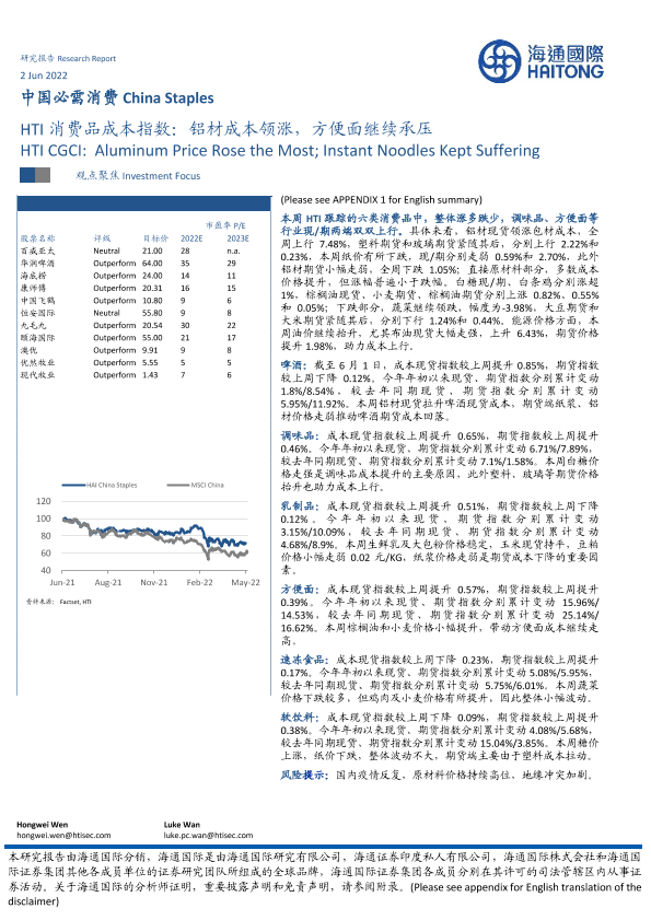 【海通国际】【20220602】中国必需消费:HTI消费品成本指数:铝材成本领涨,方便面继续承压-16页