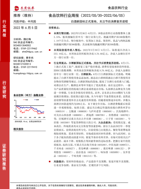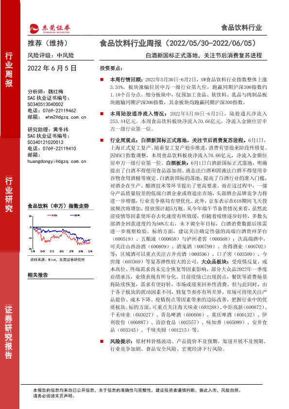 【东莞证券】【20220605】20220605-东莞证券-食品饮料行业周报:白酒新国标正式落地,关注节后消费复苏进程-14页
