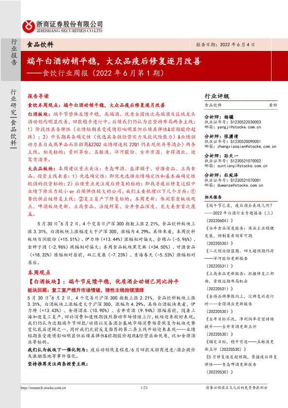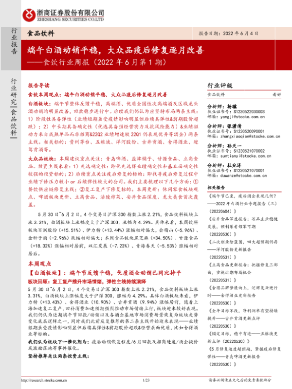 【浙商证券】【20220604】食饮行业周报(2022年6月第1期):端午白酒动销平稳,大众品疫后修复逐月改善-23页