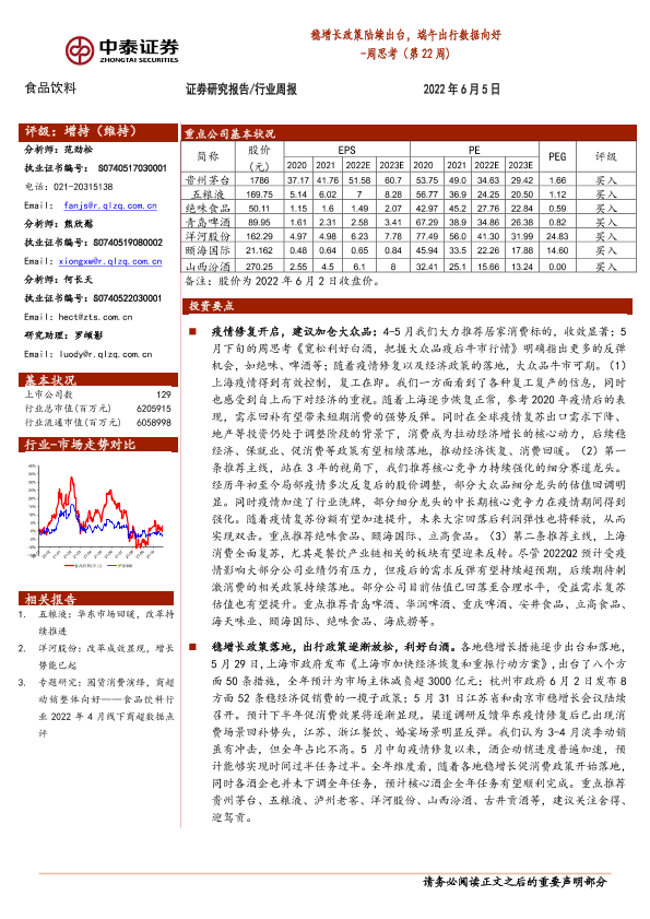 商超动销 白酒行业 稳增长政策 端午出行 食品饮料