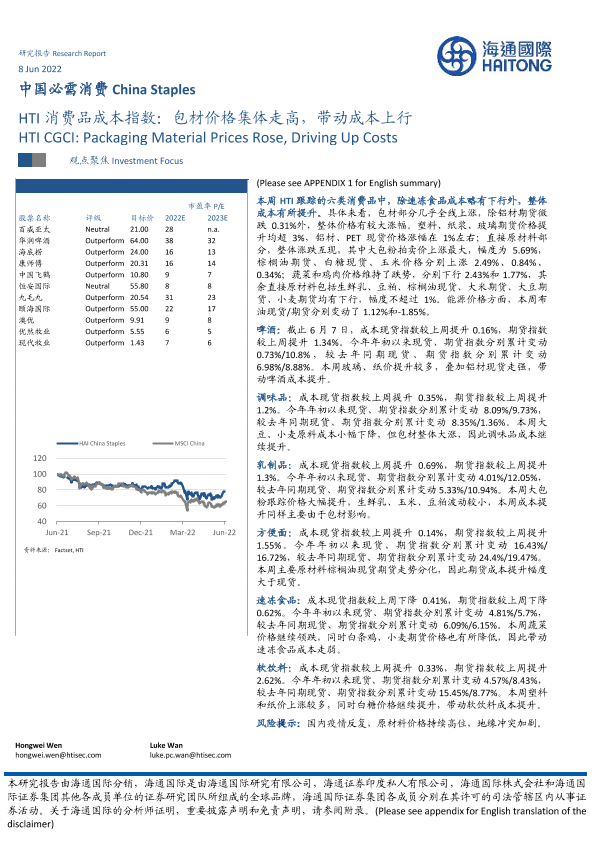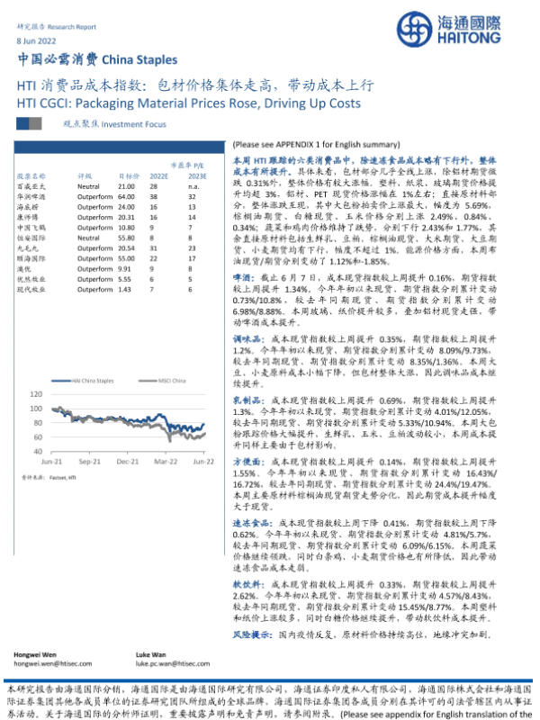 【海通国际】【20220608】中国必需消费:HTI消费品成本指数:包材价格集体走高,带动成本上行-16页