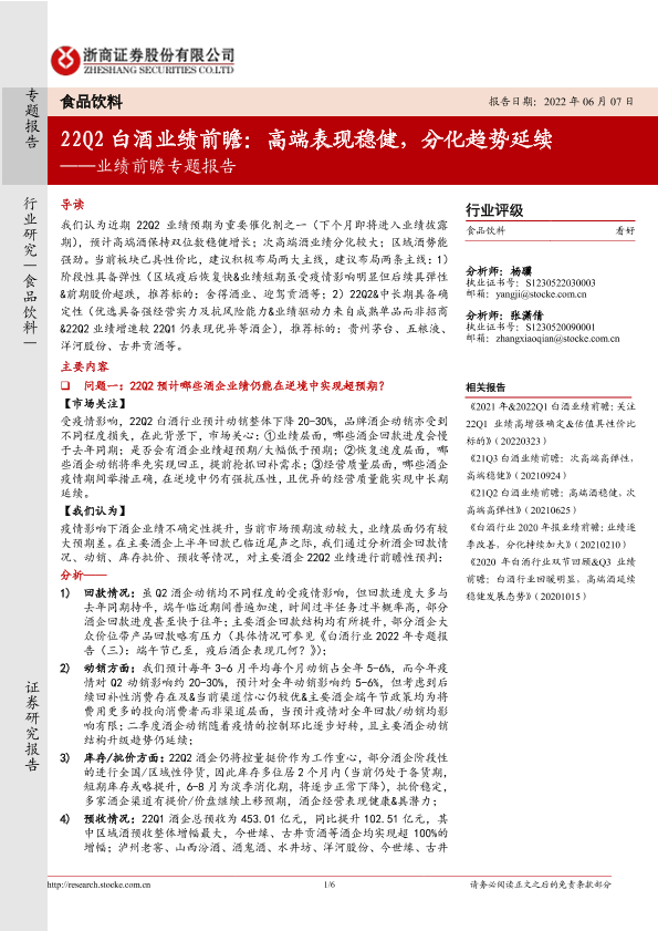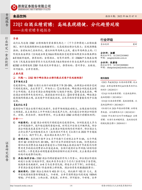 【浙商证券】【20220607】22Q2白酒业绩前瞻:高端表现稳健,分化趋势延续-6页
