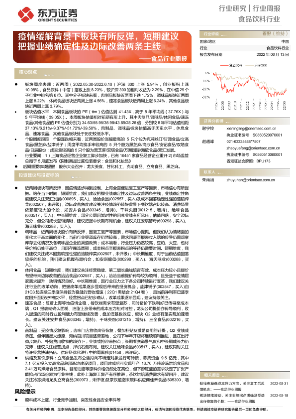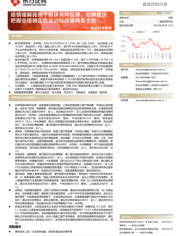 【东方证券】【20220613】20220613-东方证券-食品行业周报:疫情缓解背景下板块有所反弹,短期建议把握业绩确定性及边际改善两条主线-15页