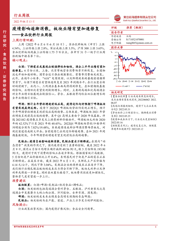 【东亚前海证券】【20220613】20220613-东亚前海证券-食品饮料行业周报:疫情影响逐渐消散,板块业绩有望加速修复-18页