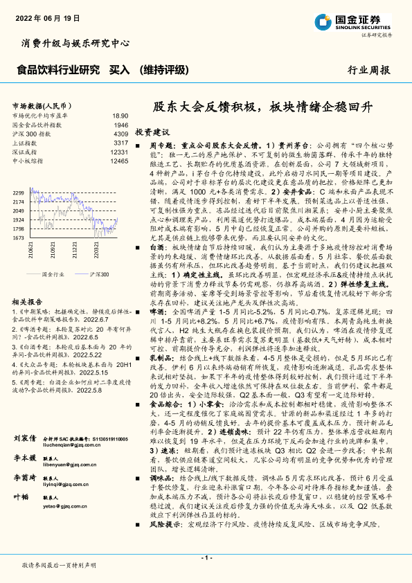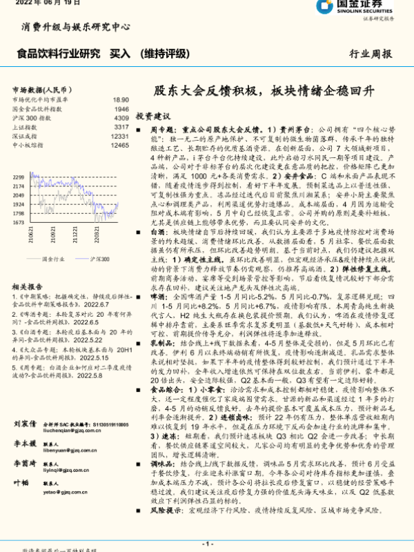 【国金证券】【20220619】食品饮料行业研究:股东大会反馈积极,板块情绪企稳回升-11页