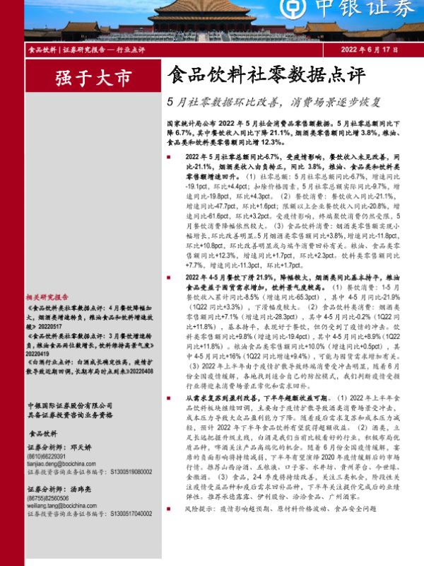 【中银证券】【20220617】食品饮料社零数据点评:5月社零数据环比改善,消费场景逐步恢复-5页