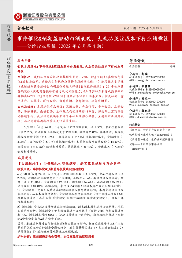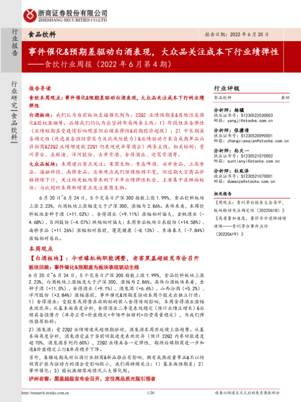 【浙商证券】【20220625】食饮行业周报(2022年6月第4期):事件催化&预期差驱动白酒表现,大众品关注成本下行业绩弹性-20页