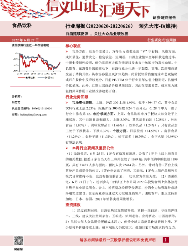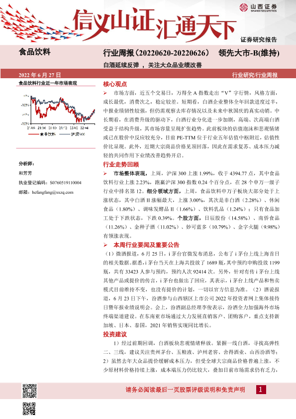 【山西证券】【20220627】食品饮料行业周报:白酒延续反弹,关注大众品业绩改善-12页