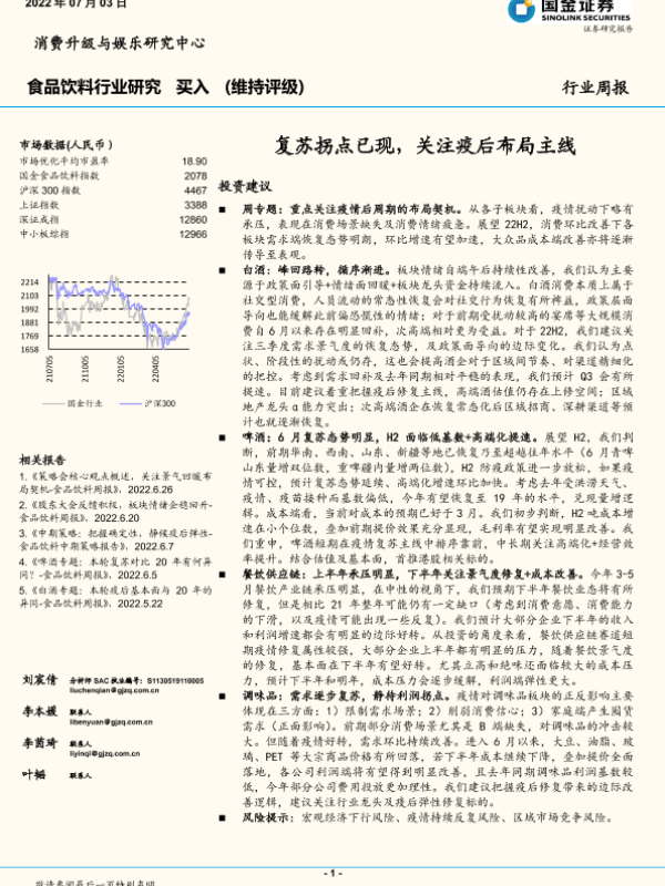 【国金证券】【20220703】20220703-国金证券-食品饮料行业研究:复苏拐点已现,关注疫后布局主线-17页