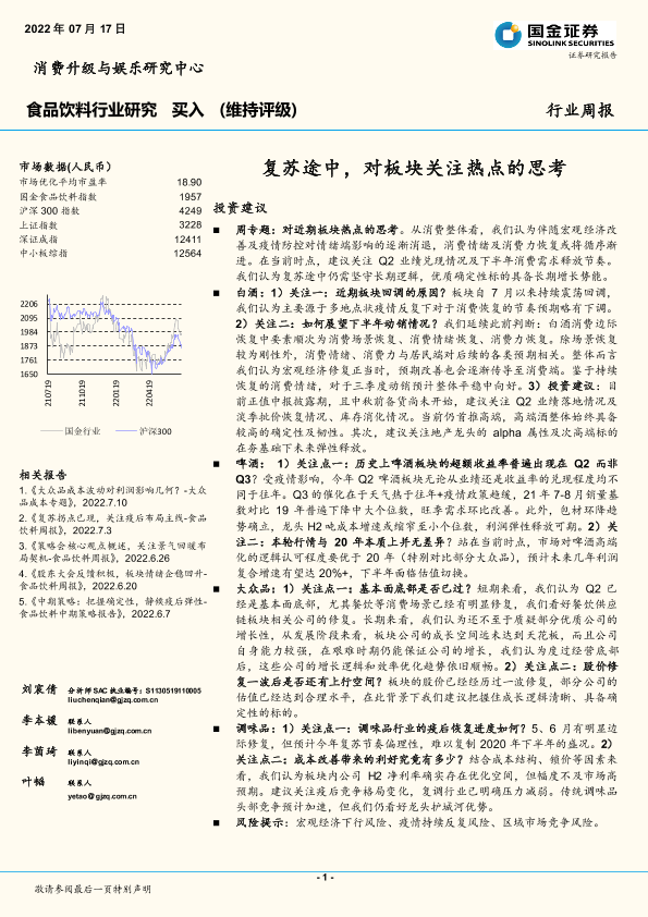 【国金证券】【20220717】20220717-国金证券-食品饮料行业研究:复苏途中,对板块关注热点的思考-14页
