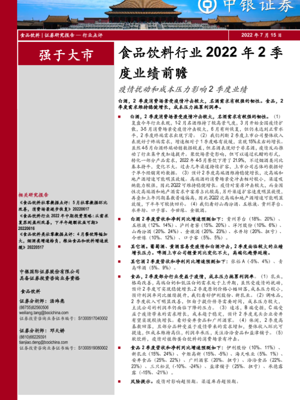 【中银证券】【20220715】食品饮料行业2022年2季度业绩前瞻:疫情扰动和成本压力影响2季度业绩-4页