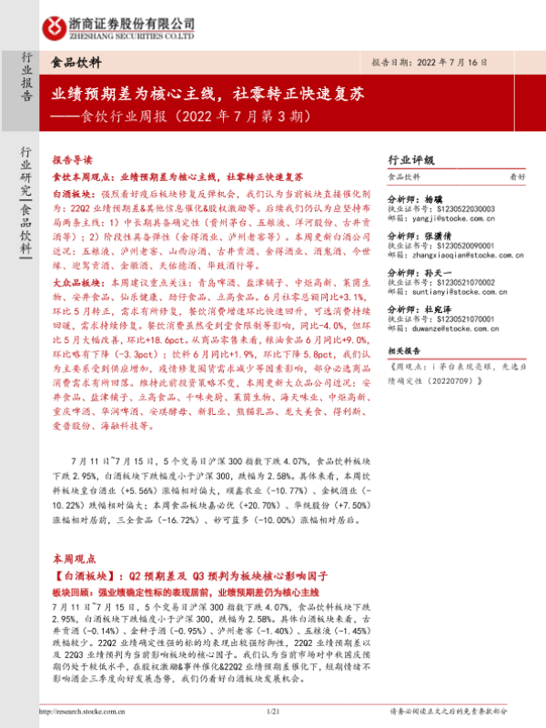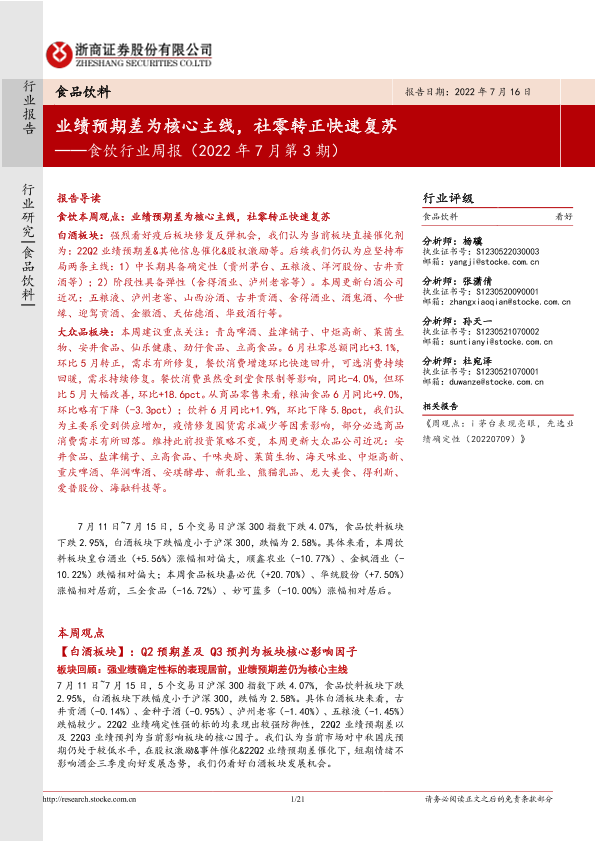 【浙商证券】【20220716】食饮行业周报(2022年7月第3期):业绩预期差为核心主线,社零转正快速复苏-21页