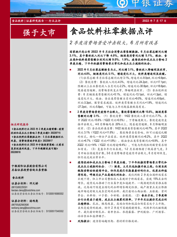 【中银证券】【20220717】食品饮料社零数据点评:2季度消费场景受冲击较大,6月所有改善-5页