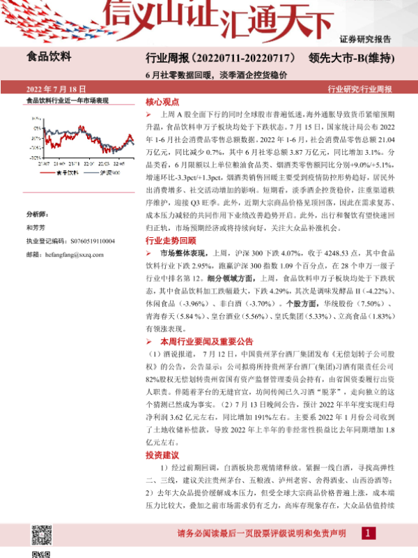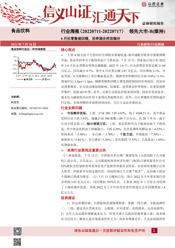 【山西证券】【20220718】食品饮料行业周报:6月社零数据回暖,淡季酒企控货稳价-12页