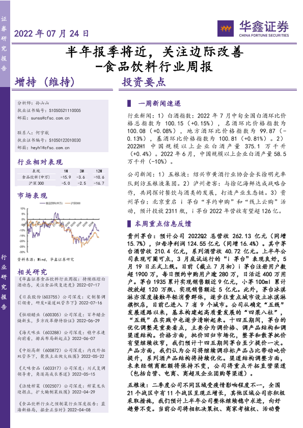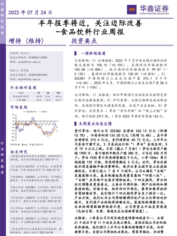 【华鑫证券】【20220724】20220724-华鑫证券-食品饮料行业周报:半年报季将近,关注边际改善-23页