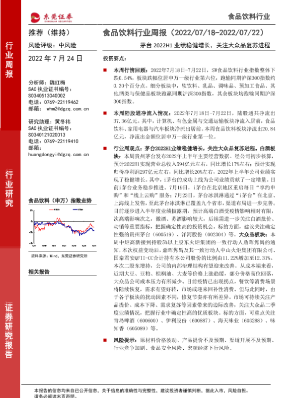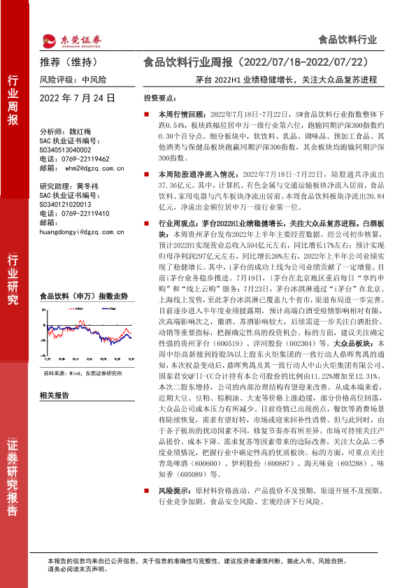 【东莞证券】【20220724】20220724-东莞证券-食品饮料行业周报:茅台2022H1业绩稳健增长,关注大众品复苏进程-14页