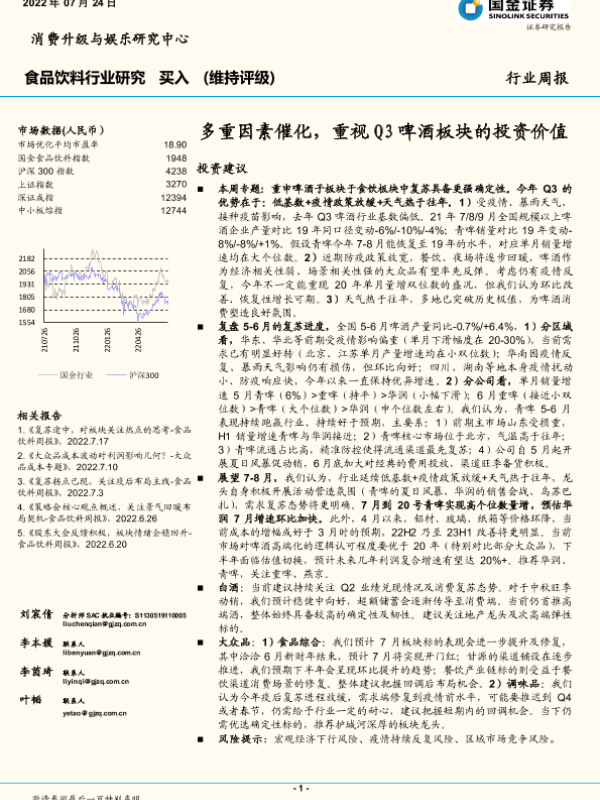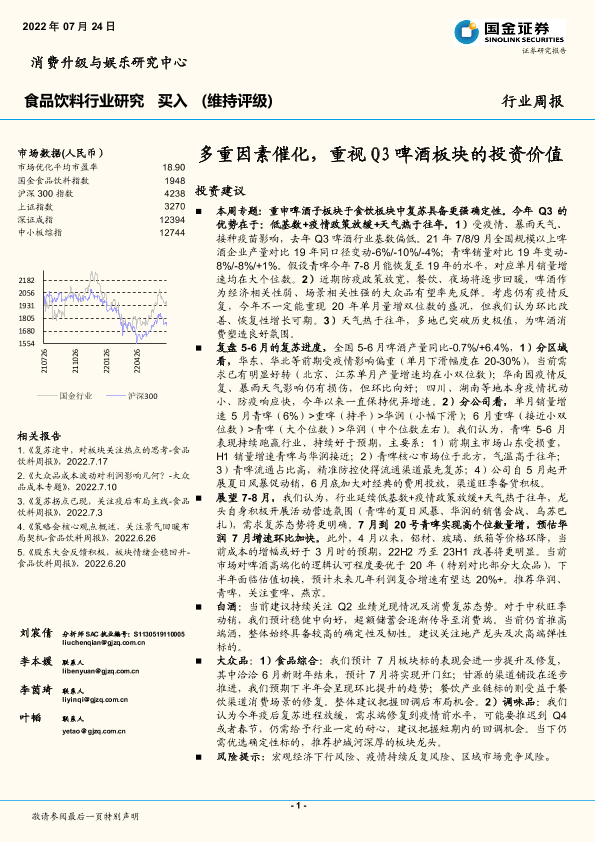 【国金证券】【20220724】20220724-国金证券-食品饮料行业研究周报:多重因素催化,重视Q3啤酒板块的投资价值-16页