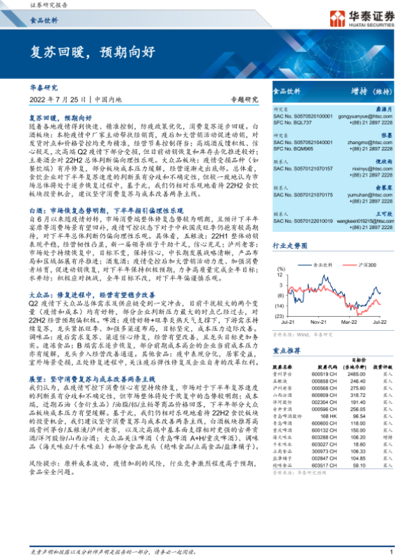 【华泰证券】【20220725】20220725-华泰证券-食品饮料专题研究:复苏回暖,预期向好-12页