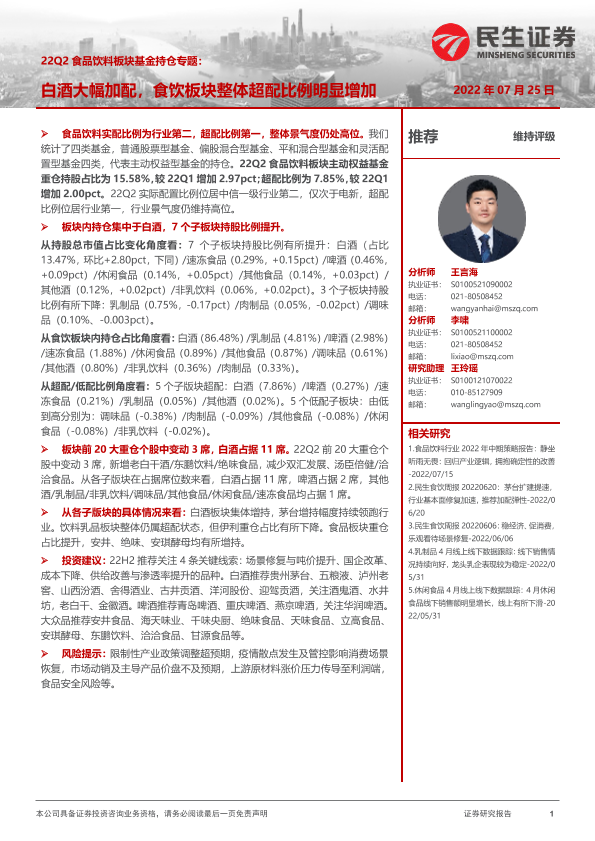【民生证券】【20220725】22Q2食品饮料板块基金持仓专题:白酒大幅加配,食饮板块整体超配比例明显增加-18页