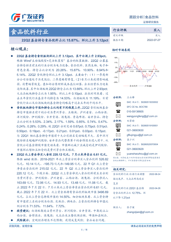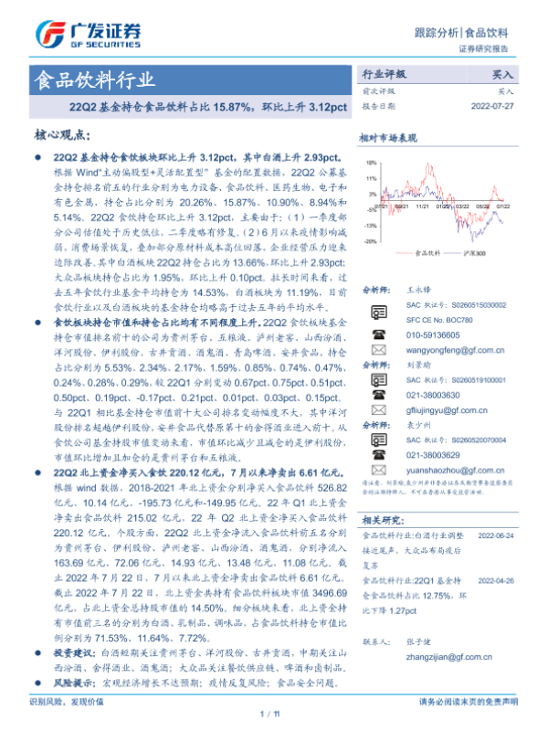 【广发证券】【20220727】22Q2基金持仓食品饮料占比15.87%,环比上升3.12pct-11页
