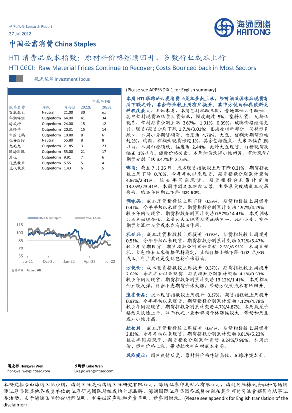 【海通国际】【20220727】中国必需消费:HTI消费品成本指数:原材料价格继续回升,多数行业成本上行-16页
