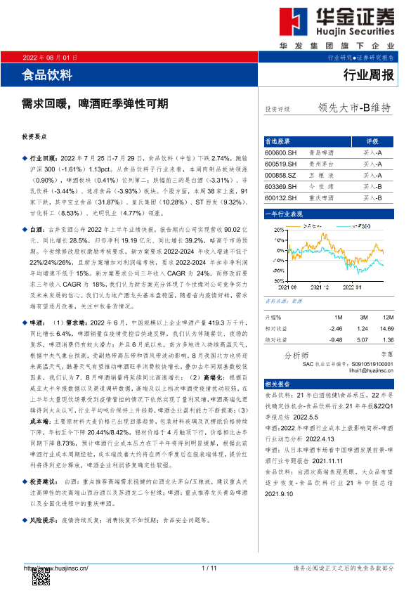 【华金证券】【20220801】20220801-华金证券-食品饮料行业周报:需求回暖,啤酒旺季弹性可期-11页