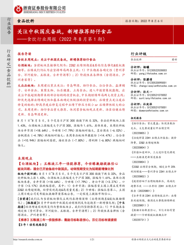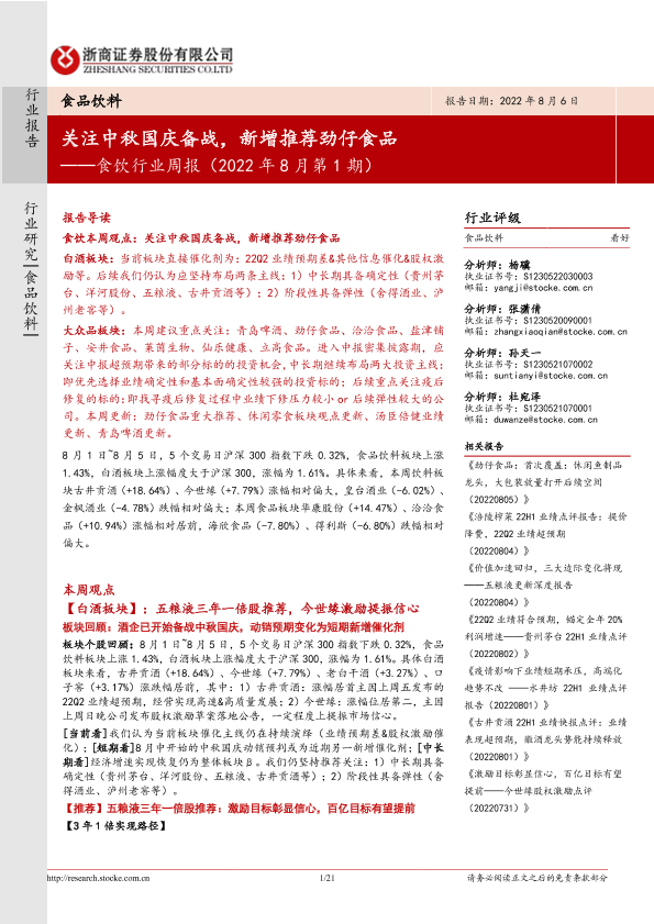【浙商证券】【20220806】食饮行业周报(2022年8月第1期):关注中秋国庆备战,新增推荐劲仔食品-21页