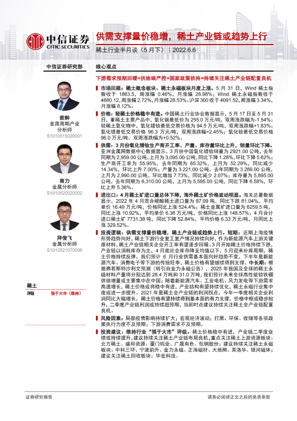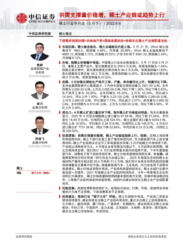 【中信证券】【20220606】稀土行业半月谈(5月下):供需支撑量价稳增,稀土产业链或趋势上行-35页