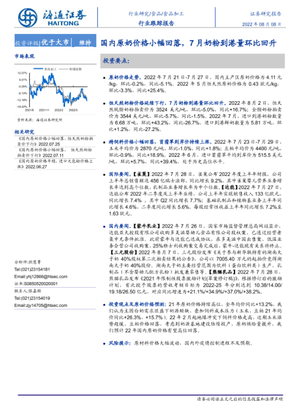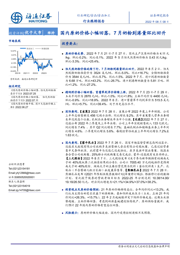 【海通证券】【20220808】20220808-海通证券-食品加工行业跟踪报告:国内原奶价格小幅回落,7月奶粉到港量环比回升-11页