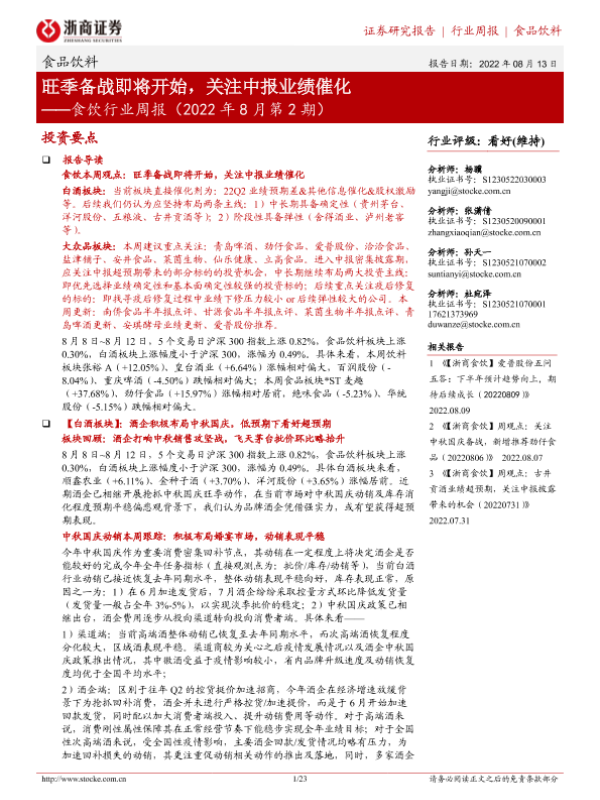 【浙商证券】【20220813】食饮行业周报(2022年8月第2期):旺季备战即将开始,关注中报业绩催化-23页
