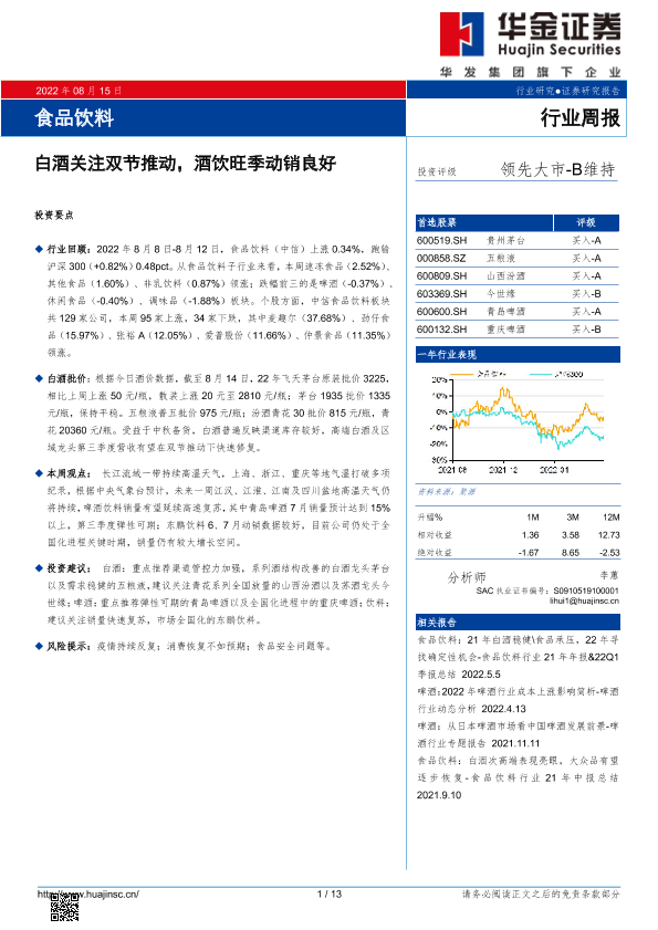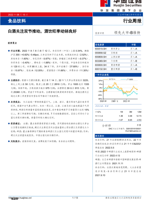 【华金证券】【20220815】食品饮料行业周报:白酒关注双节推动,酒饮旺季动销良好-13页