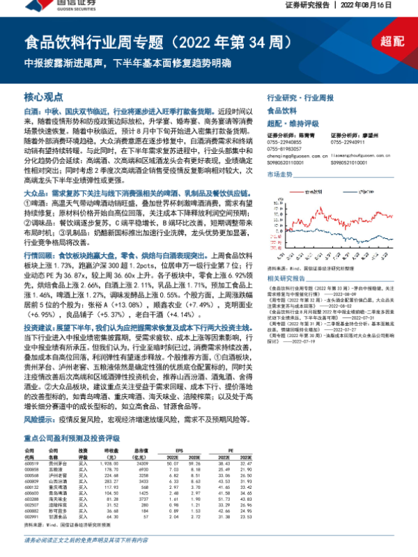 【国信证券】【20220816】食品饮料行业周专题(2022年第34周):中报披露渐进尾声,下半年基本面修复趋势明确-10页