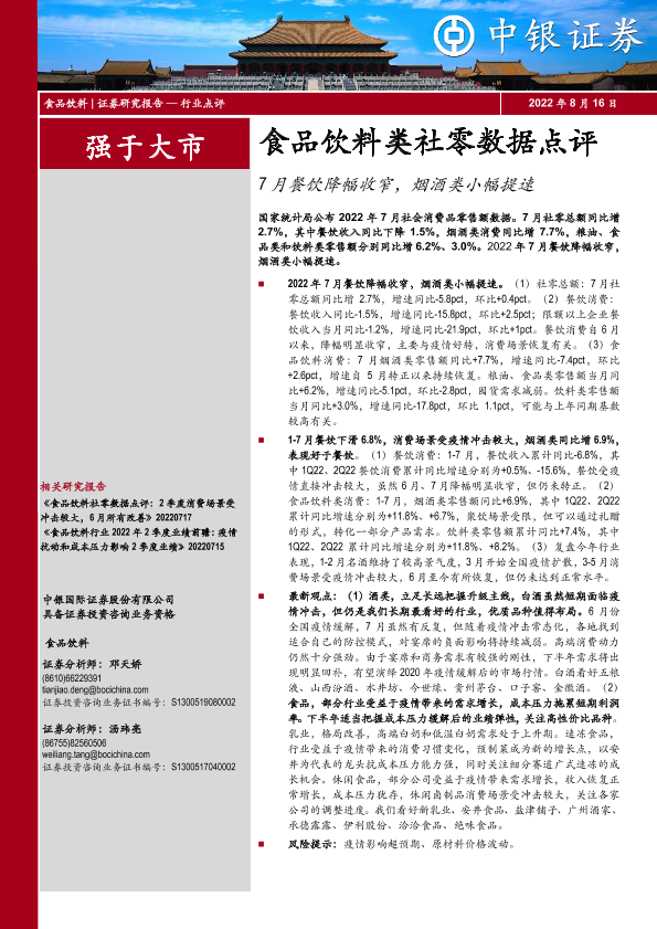 【中银证券】【20220816】食品饮料类社零数据点评:7月餐饮降幅收窄,烟酒类小幅提速-5页