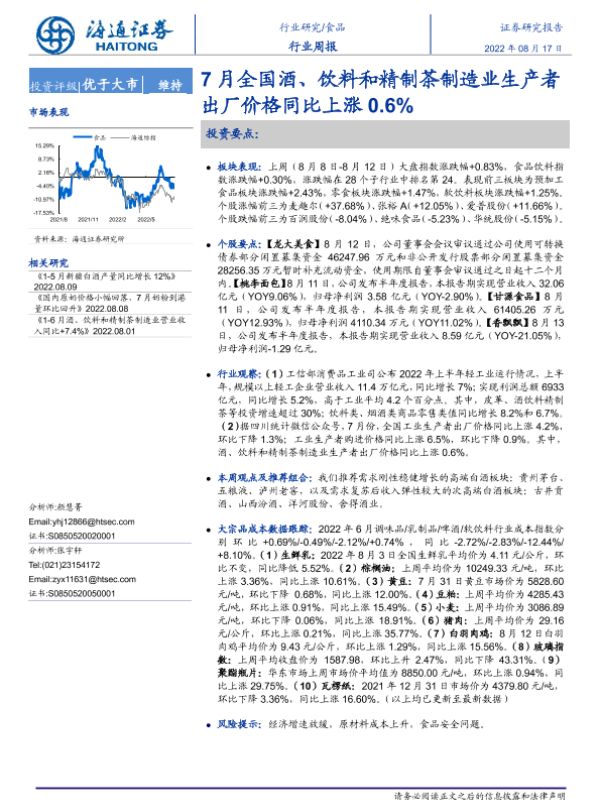 【海通证券】【20220817】20220817-海通证券-食品行业周报:7月全国酒、饮料和精制茶制造业生产者出厂价格同比上涨0.6%-12页