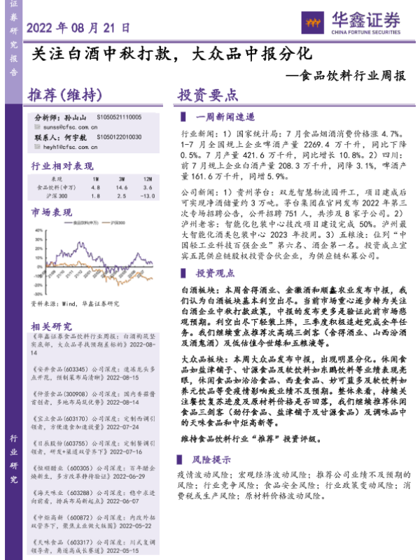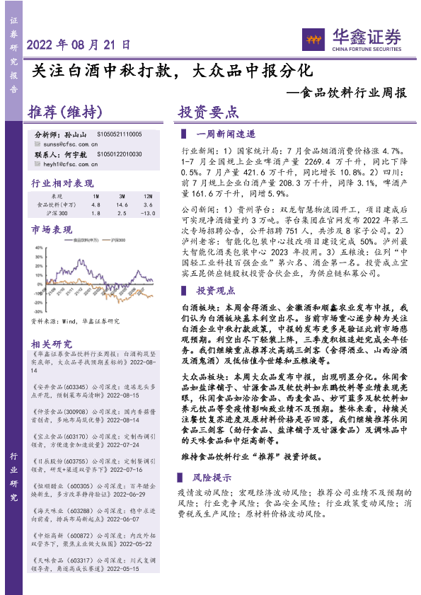 【华鑫证券】【20220821】食品饮料行业周报:关注白酒中秋打款,大众品中报分化-25页
