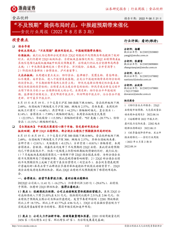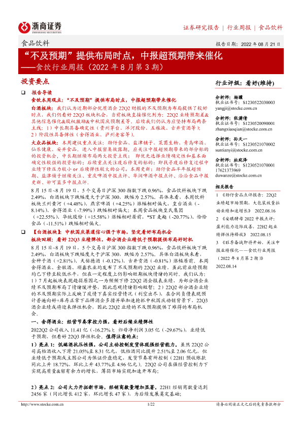【浙商证券】【20220821】食饮行业周报(2022年8月第3期):“不及预期”提供布局时点,中报超预期带来催化-22页