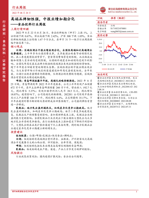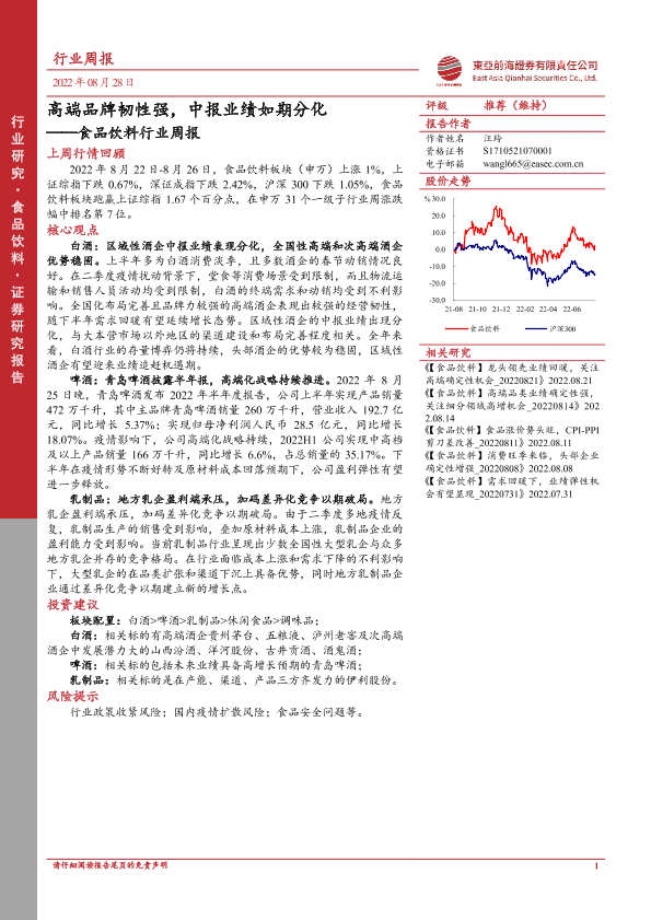 【东亚前海证券】【20220828】20220828-东亚前海证券-食品饮料行业周报:高端品牌韧性强,中报业绩如期分化-19页