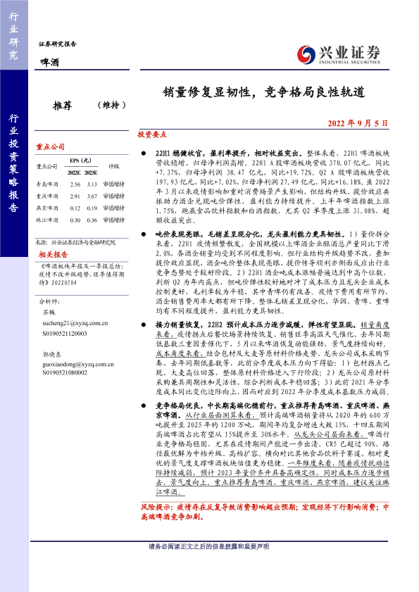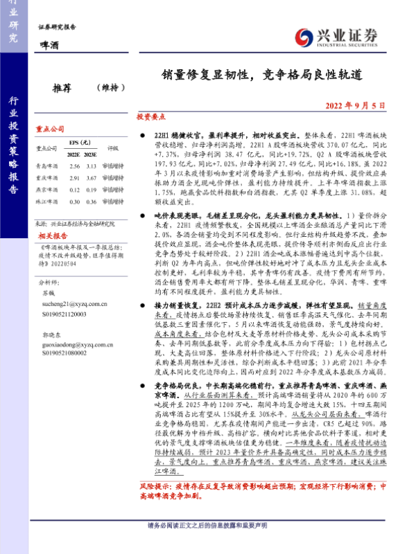 【兴业证券】【20220905】20220905-兴业证券-啤酒行业投资策略报告:销量修复显韧性,竞争格局良性轨道-15页