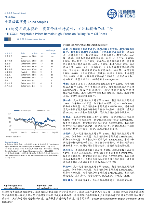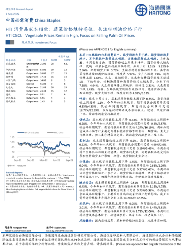 【海通国际】【20220907】中国必需消费:HTI消费品成本指数:蔬菜价格维持高位,关注棕榈油价格下行-16页