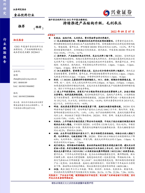 【兴业证券】【20220907】海外食品饮料行业2022年中报业绩综述:持续推进产品结构升级,毛利承压-39页