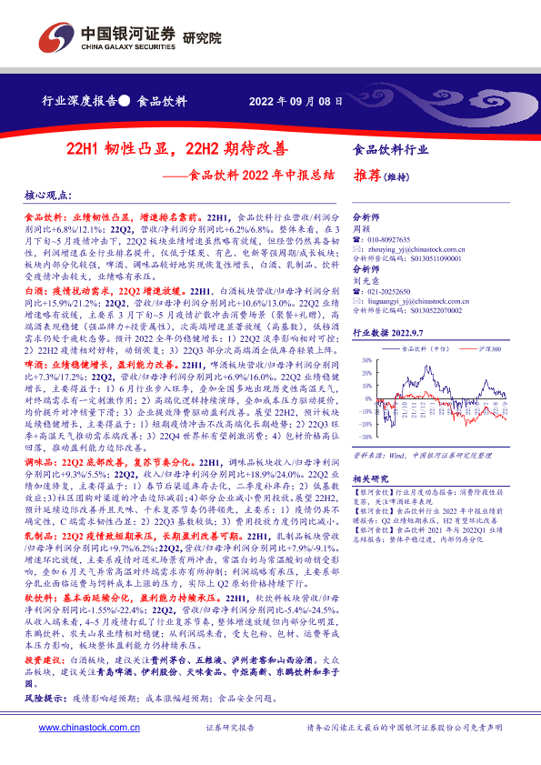 【银河证券】【20220908】食品饮料2022年中报总结:22H1韧性凸显,22H2期待改善-19页