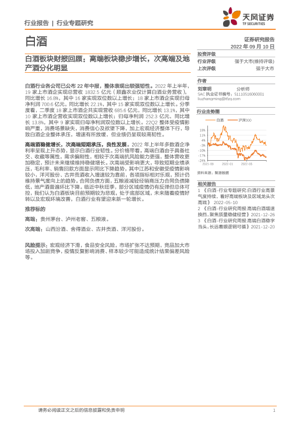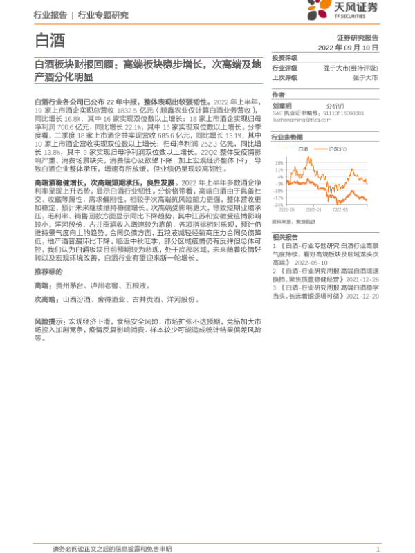 【天风证券】【20220910】20220910-天风证券-白酒板块财报回顾:高端板块稳步增长,次高端及地产酒分化明显-14页