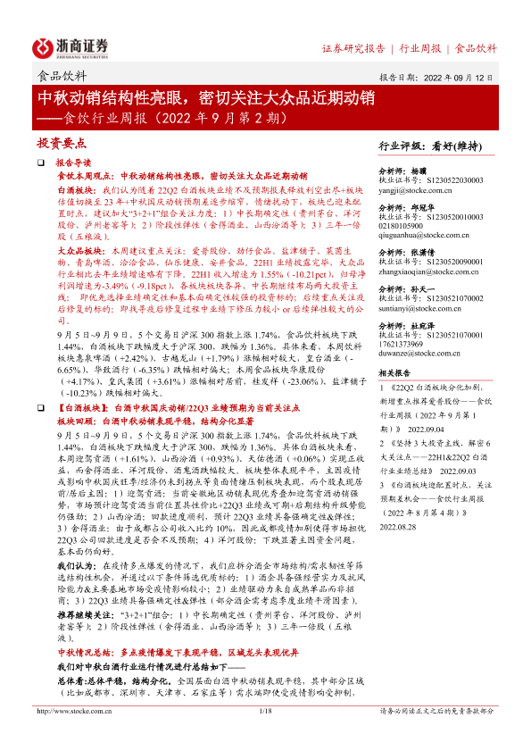 【浙商证券】【20220912】食饮行业周报(2022年9月第2期):中秋动销结构性亮眼,密切关注大众品近期动销-18页