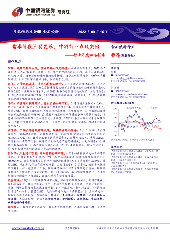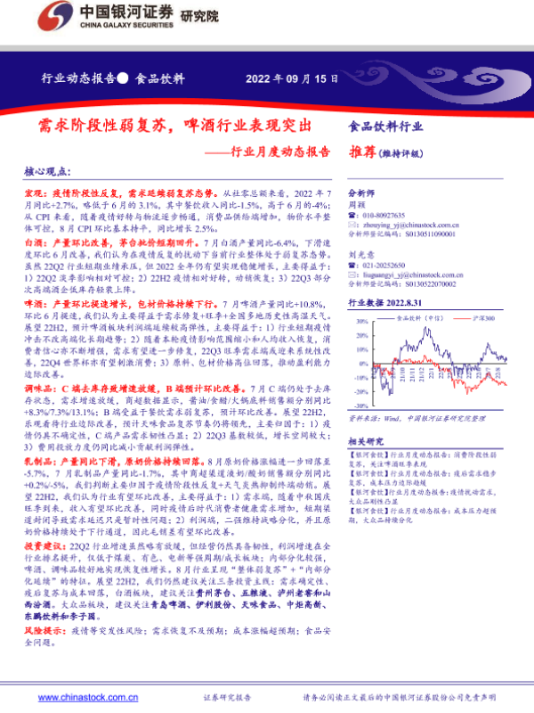 【银河证券】【20220915】20220915-中国银河-食品饮料行业月度动态报告:需求阶段性弱复苏,啤酒行业表现突出-22页