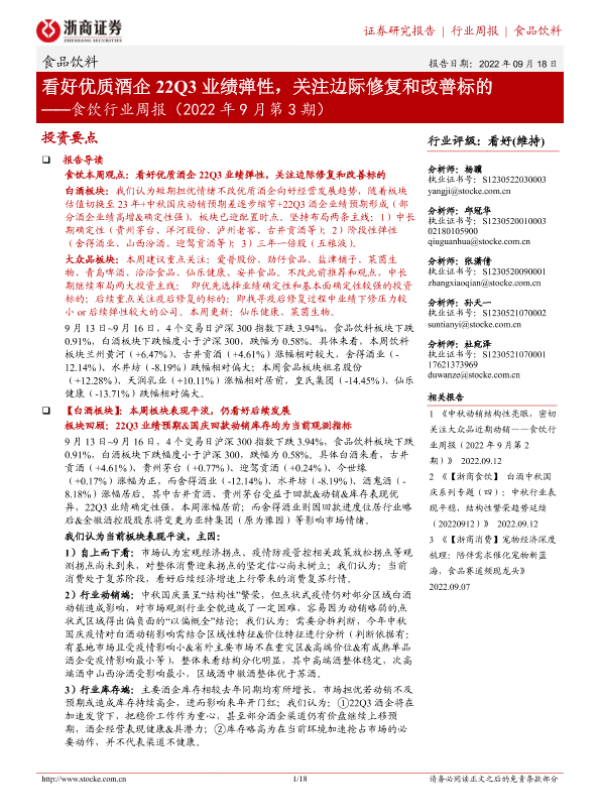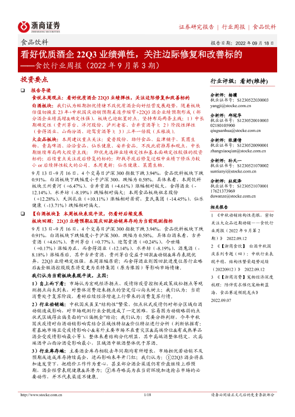 【浙商证券】【20220918】食饮行业周报(2022年9月第3期):看好优质酒企22Q3业绩弹性,关注边际修复和改善标的-18页