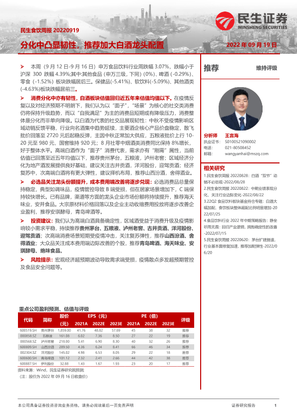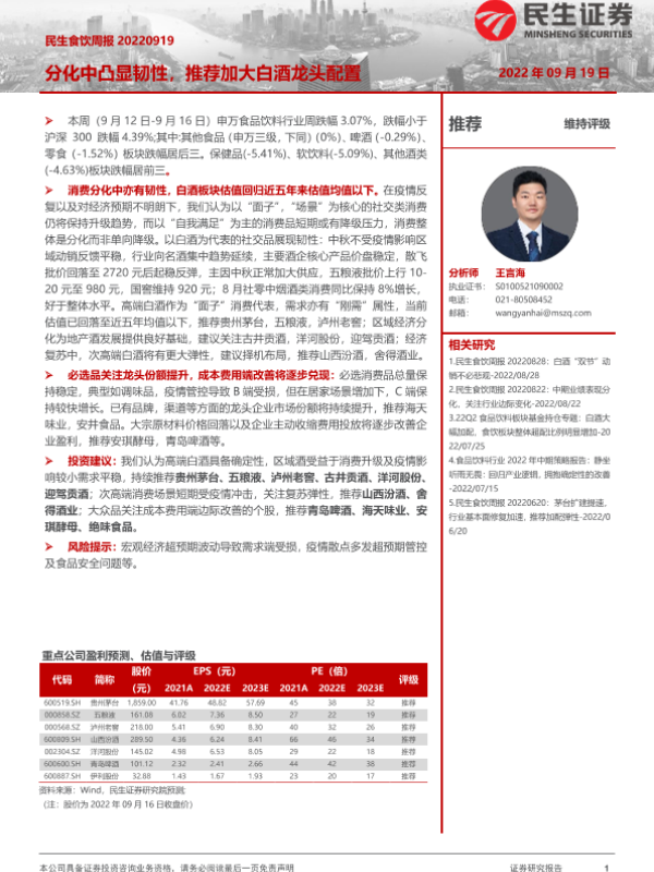 【民生证券】【20220919】民生食饮周报:分化中凸显韧性,推荐加大白酒龙头配置-19页