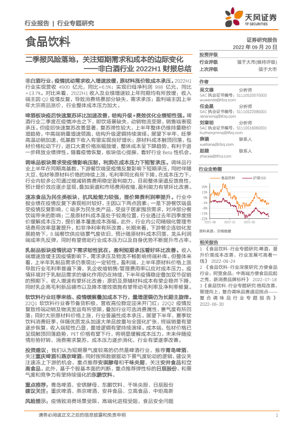 【天风证券】【20220920】非白酒行业2022H1财报总结:二季报风险落地,关注短期需求和成本的边际变化-20页