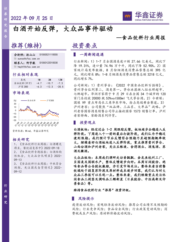 【华鑫证券】【20220925】20220925-华鑫证券-食品饮料行业周报:白酒开始反弹,大众品事件驱动-19页