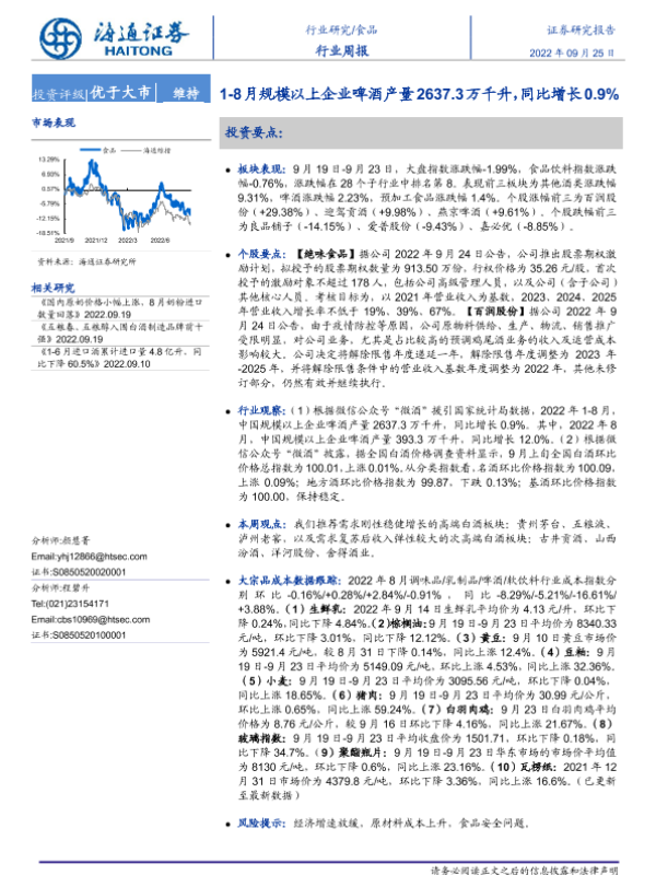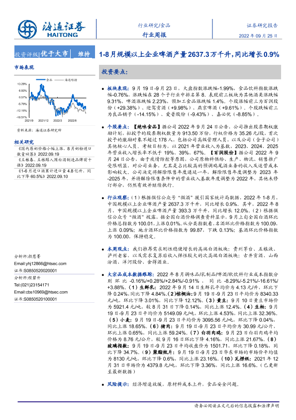 【海通证券】【20220925】20220925-海通证券-食品行业周报:1-8月规模以上企业啤酒产量2637.3万千升,同比增长0.9%-11页